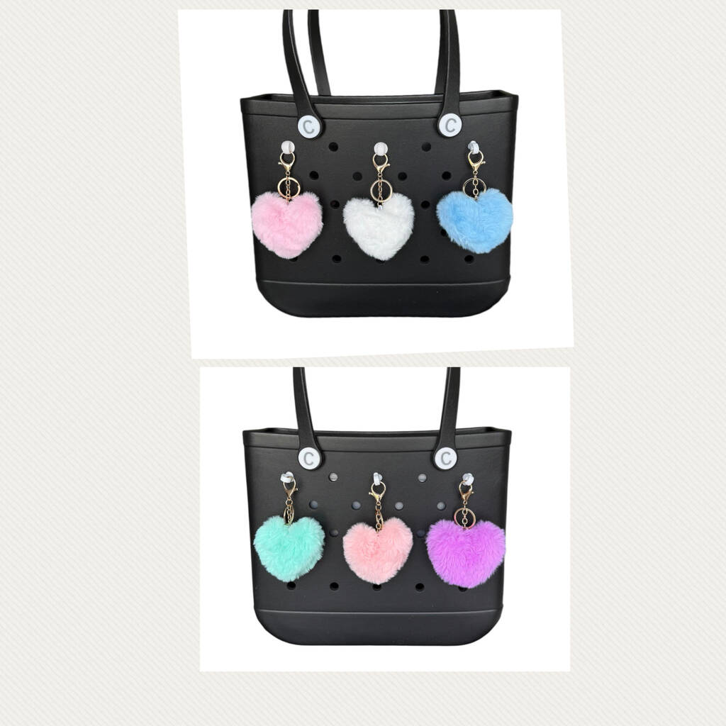 New! Faux Fur Fluffy Heart/ Pom Pom Keyring’s , Six Colours, Two Designs