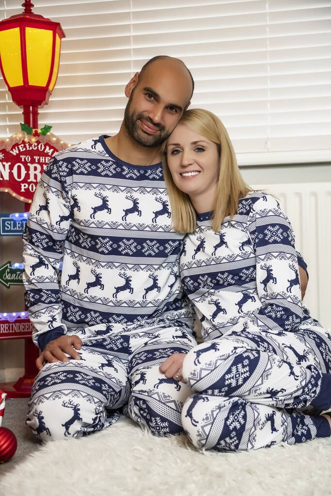 Luxuriously soft matching family Christmas pyjamas in navy and white reindeer print – made from premium 95% cotton and perfect for cosy festive moments together.