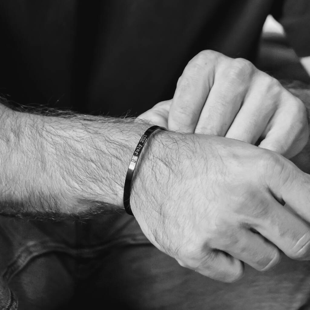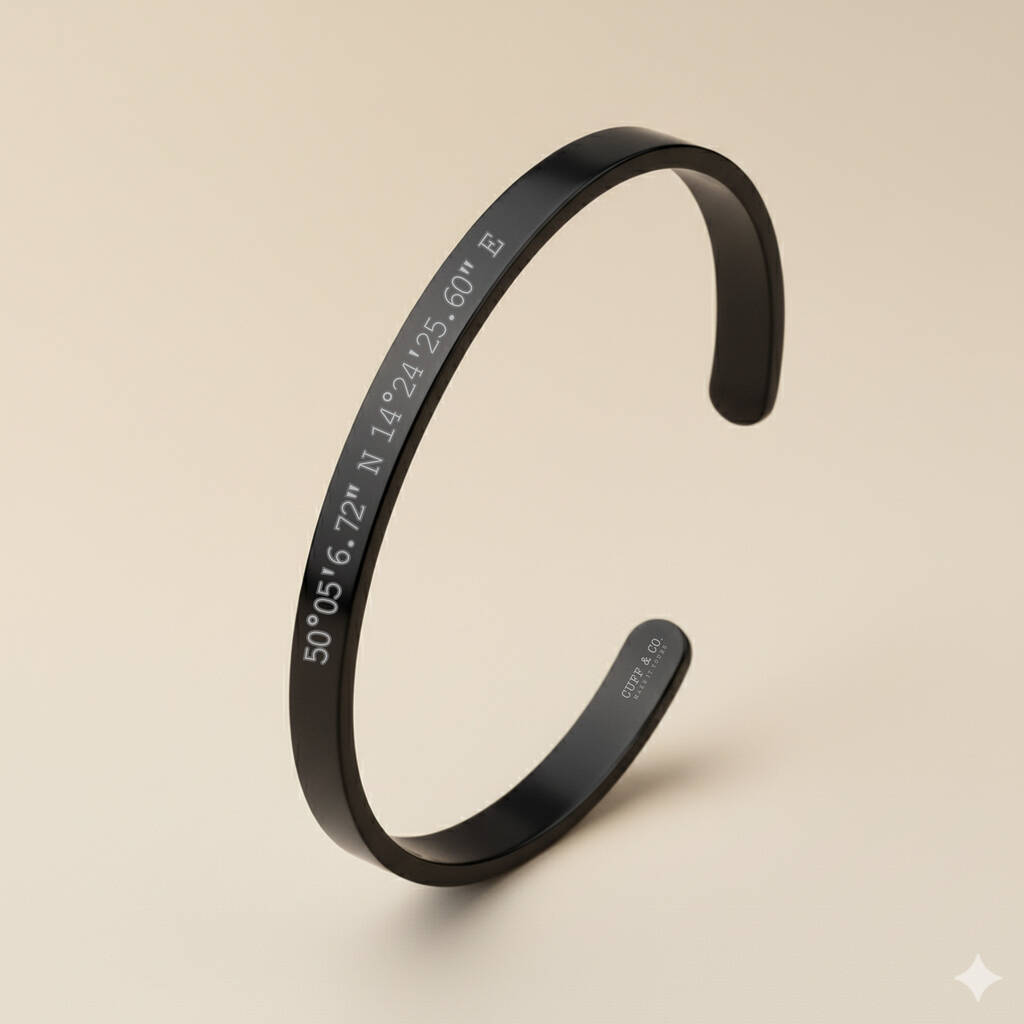 A sleek, personalised Black Cuff Bracelet made from waterproof, hypoallergenic stainless steel. Customise with names, dates, or coordinates. Adjustable, durable, and hand-finished in Sussex.