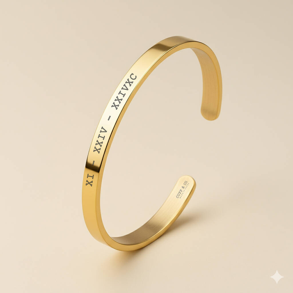 Our cuff bracelets are available in five stunning finishes: Silver, Gold, Rose Gold, Black, and Navy, each crafted from durable, hypoallergenic stainless steel. These bracelets offer a sleek, minimalist design that can be personalised with your choice of engraving. Whether it’s a name, date, coordinates, or a meaningful phrase, your message can be engraved on the inside or outside of the cuff, allowing for a personal touch that speaks to your unique style and sentiments.