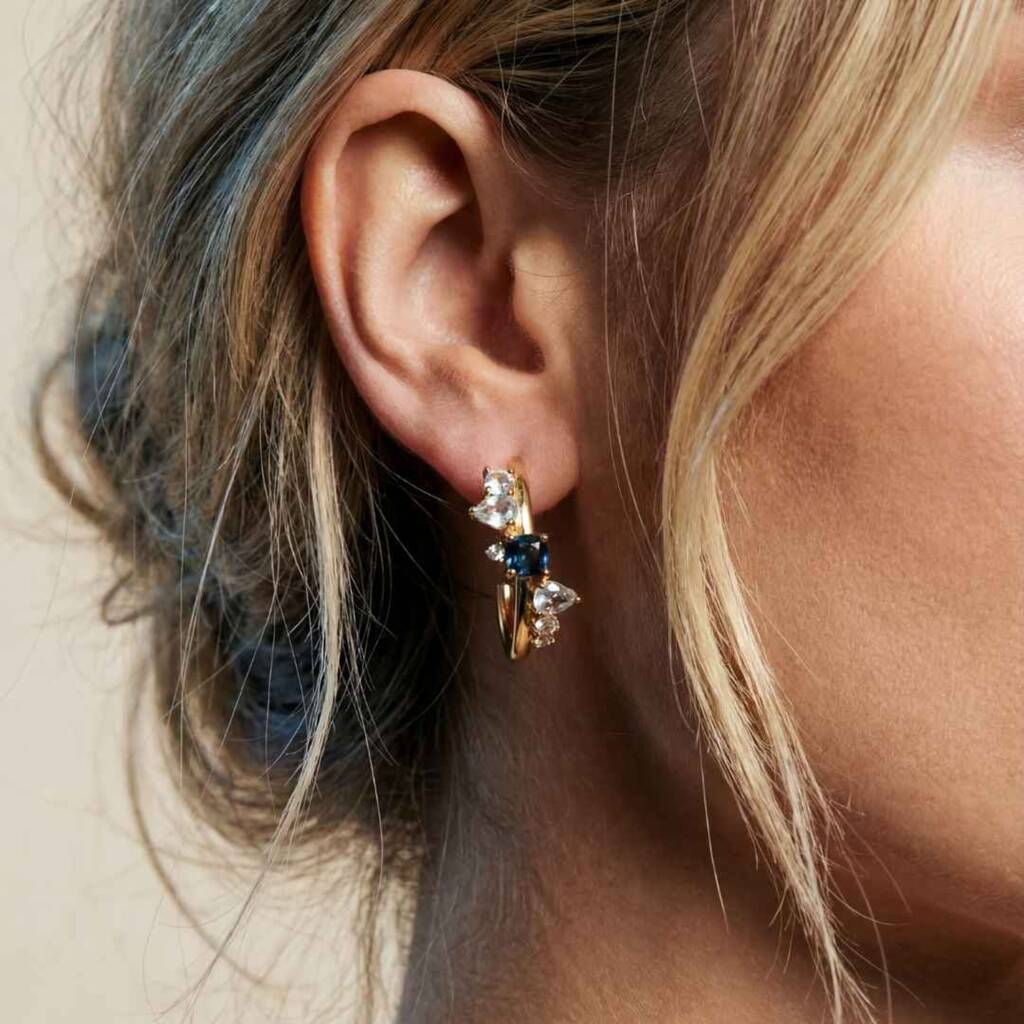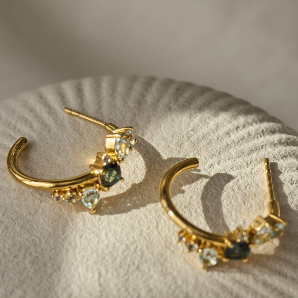The Seren Hoops feature fourteen white topaz gemstones set in 2.5cm sterling silver with 18ct gold vermeil finish. Named after the Welsh word for "star," these handmade celestial hoop earrings showcase constellation patterns that catch light creating delicate sparkle with movement.