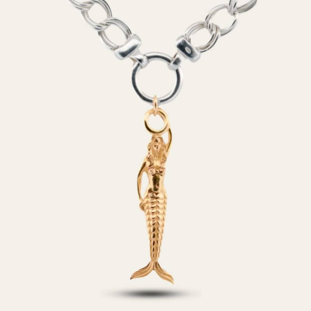 The Maxi Zennor Necklace features a large 5cm 18ct Gold vermeil mermaid pendant suspended from a chunky 50cm/20" sterling silver chunky belcher chain.