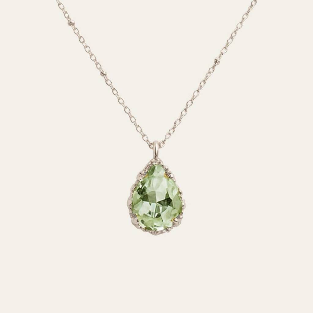 The Alba Necklace, from our 1763 collection, showcases a distinctive design inspired by our brand logo. Crafted from solid sterling silver, this piece features an intricate granulation technique, perfectly highlighting a stunning 10x8 pear-cut green Quartz gemstone. The gemstone’s ocean hues shimmer in various shades of green under the sunlight, adding elegance to any outfit.