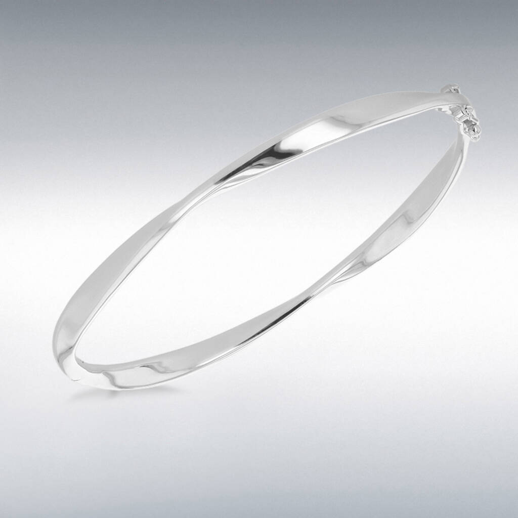 A polished sterling silver bangle with a subtle twisted design, finished with rhodium plating for lasting shine. A timeless piece, perfect for gifting.