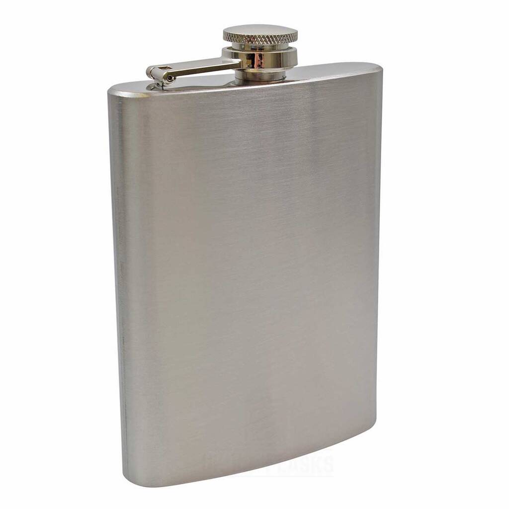 A sleek 8oz satin stainless steel hip flask, perfect for gifting. Optional engraving makes it a personal gift for Best Men, Fathers Day, birthdays.