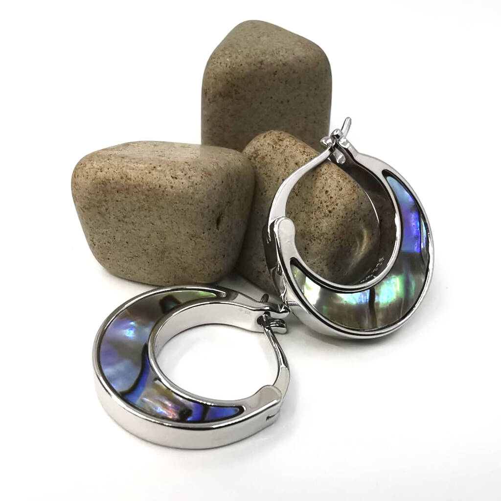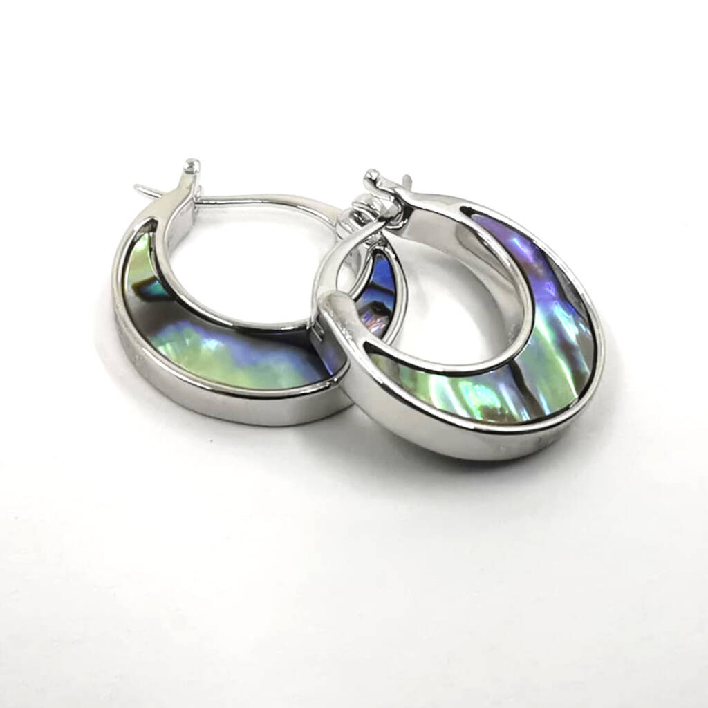 Elegant sterling silver creole earrings featuring luminous New Zealand paua shell inlays, offering iridescent ocean hues and timeless sophistication for everyday or special-occasion wear.