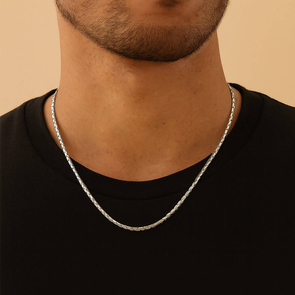 This titanium snake chain is crafted with smooth, flexible links that sit comfortably against the skin.