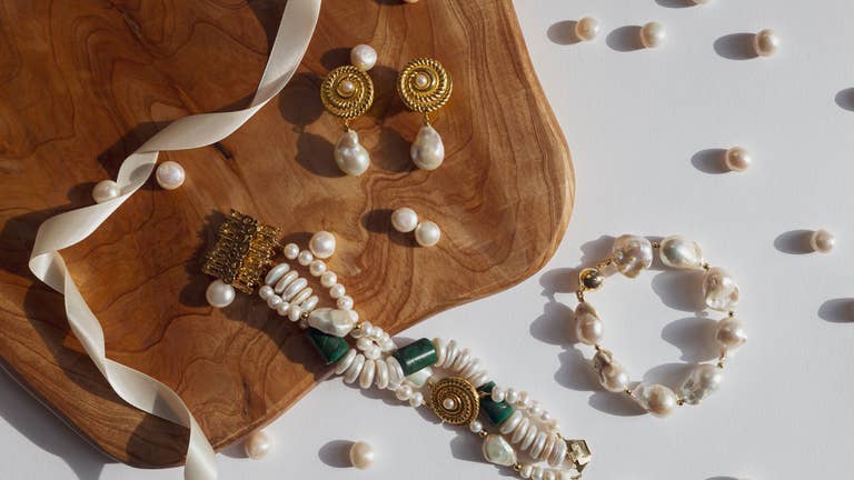 Each piece in our luxury collection is only one-of-a-kind and is made of baroque and rare pearls, semiprecious gemstones and gold plated silver