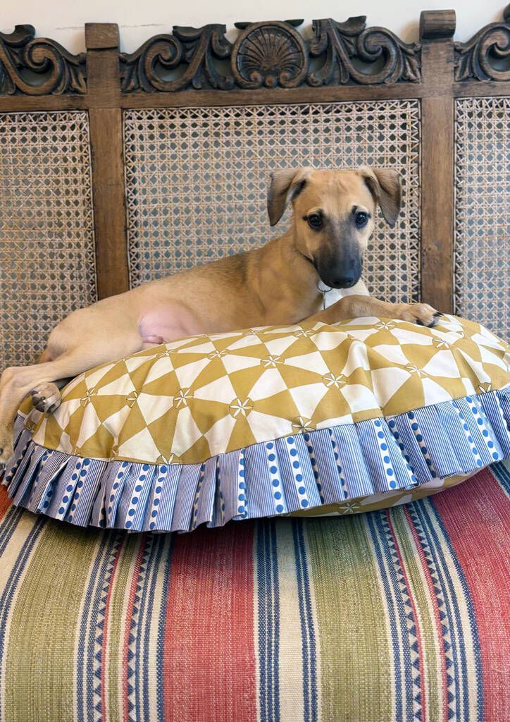 Yellow Checker and Blue Stripe Frilly Dog Bed: Stylish, comfy 70 cm circular cotton bed with frill trim. Machine washable, durable, and Made in England.