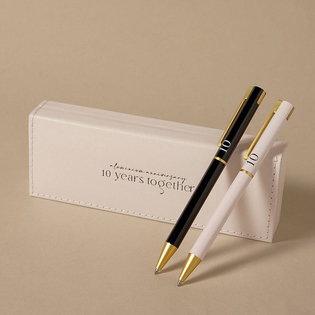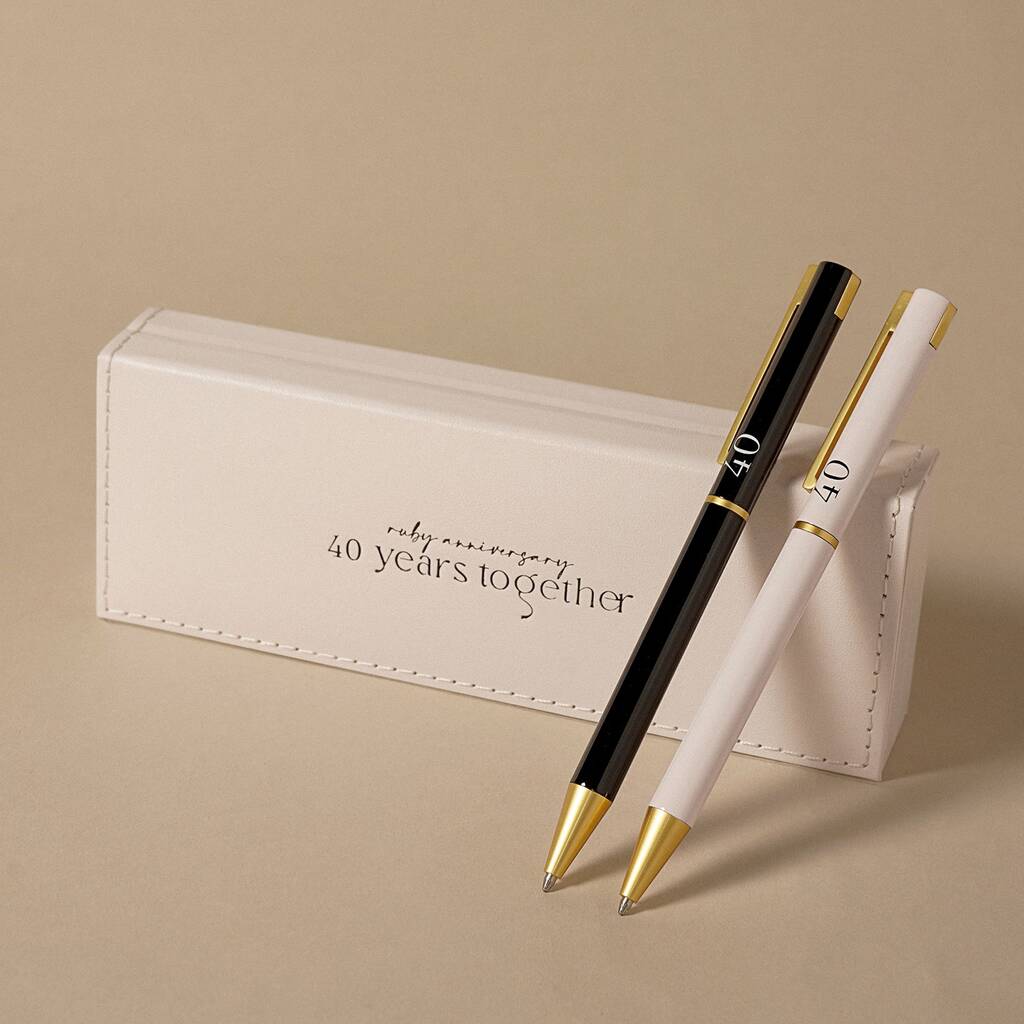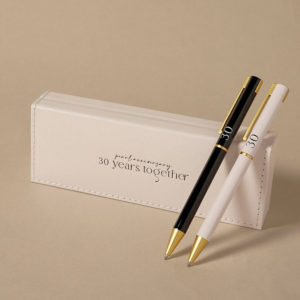 Each set includes two elegant pens in timeless black, white and gold finishes, beautifully presented in a luxury gift box inscribed with your chosen milestone.