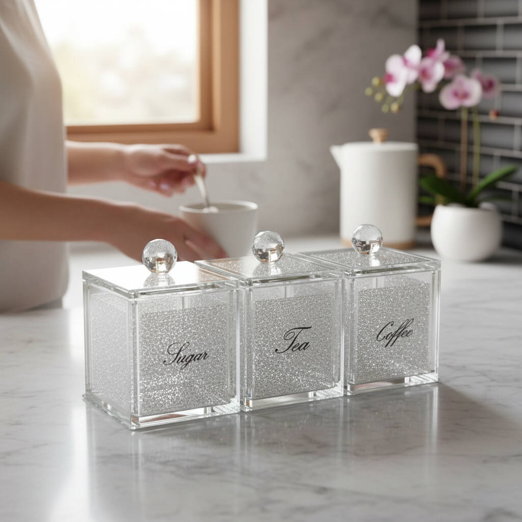 Having a refreshing cup of tea or coffee can rescue your day, and with the contemporary style and finish of our 3 Piece Coffee, Tea, & Sugar Jar Set, not only can you keep your kitchen organised, but you can add some sparkle to your decor!