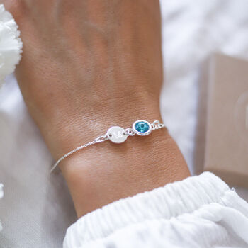 A sweet and meaningful 16th birthday bracelet with a birthstone and hand-stamped initial – a personalised keepsake to celebrate this special milestone.