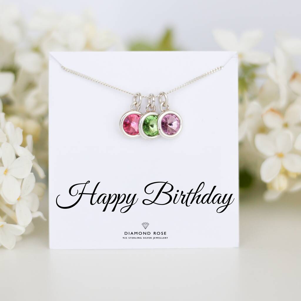 A personalised birthstone necklace with a Happy Birthday message card, designed to celebrate someone special with a gift that represents the people she loves most.