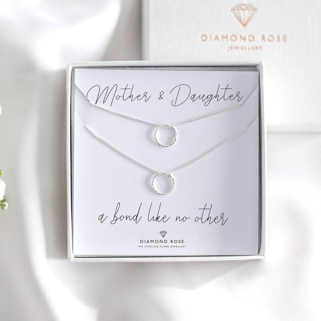 Each set includes two elegantly designed circle necklaces, representing the endless love shared between a mother and her daughter. Delivered in a sophisticated white jewelry box, with the option to add a satin gift bag, this set makes for a memorable unboxing experience. Choose to send it directly to your loved one with a personalized gift message at no extra cost, making it a truly heartfelt present.