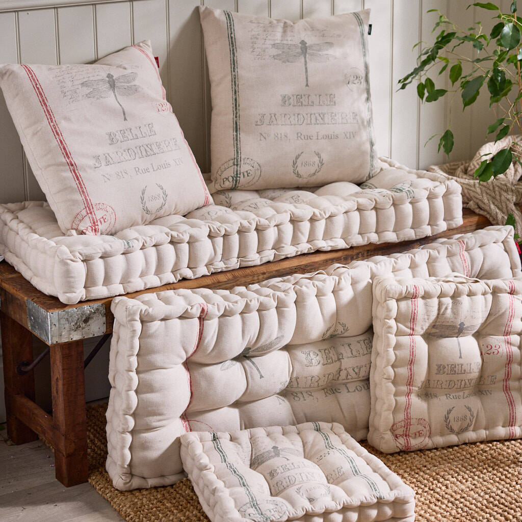 Bring a touch of style and comfort to your garden seating with our range of padded cushions, boasting a vintage French style design.