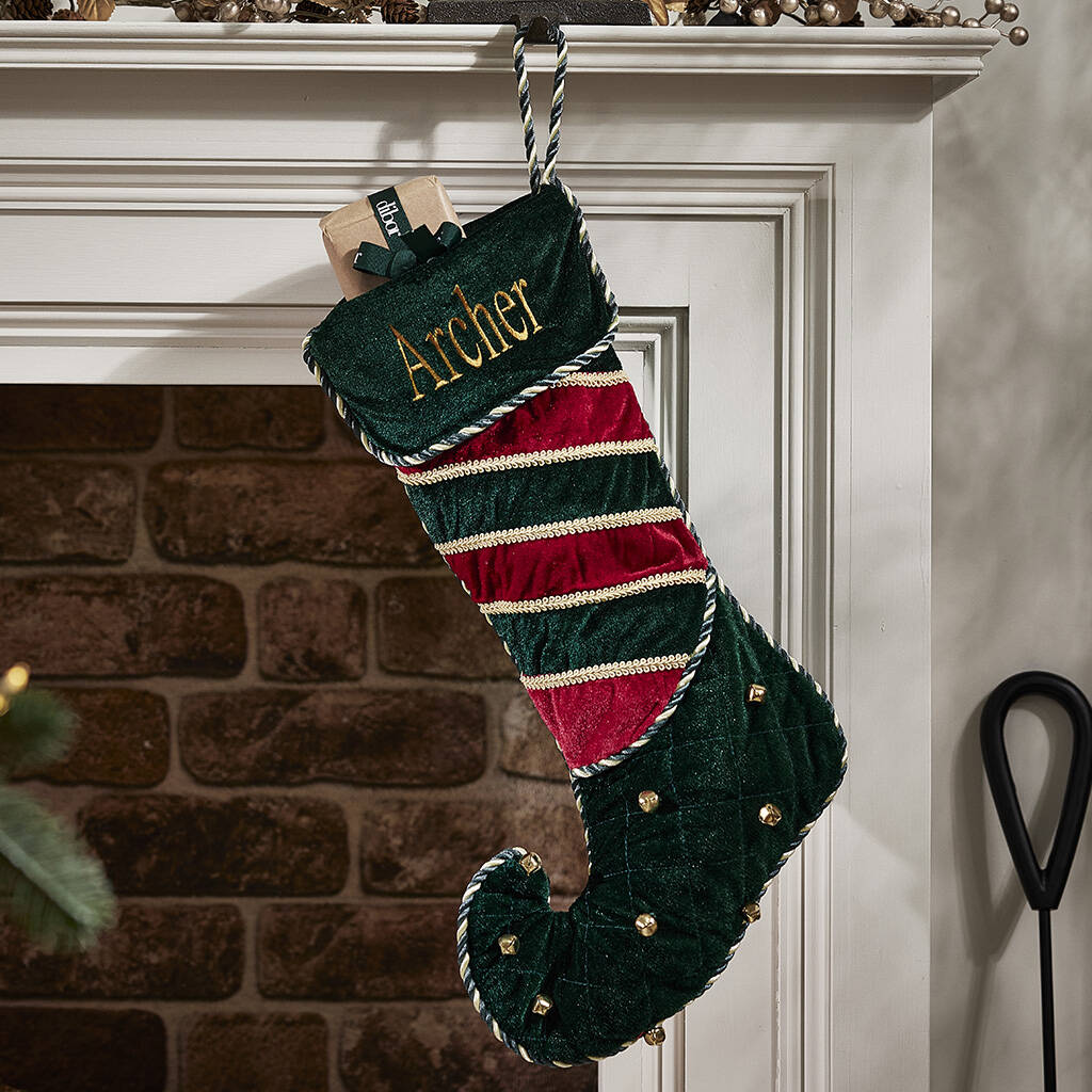 Boasting a quirky curled toe, dotted with working sleigh bells that really jingle! The stripes of festive red and green are set off beautifully by the luxurious gold piping and tassel detail - perfect to create an impressive feature that children and grown ups alike are sure to love.