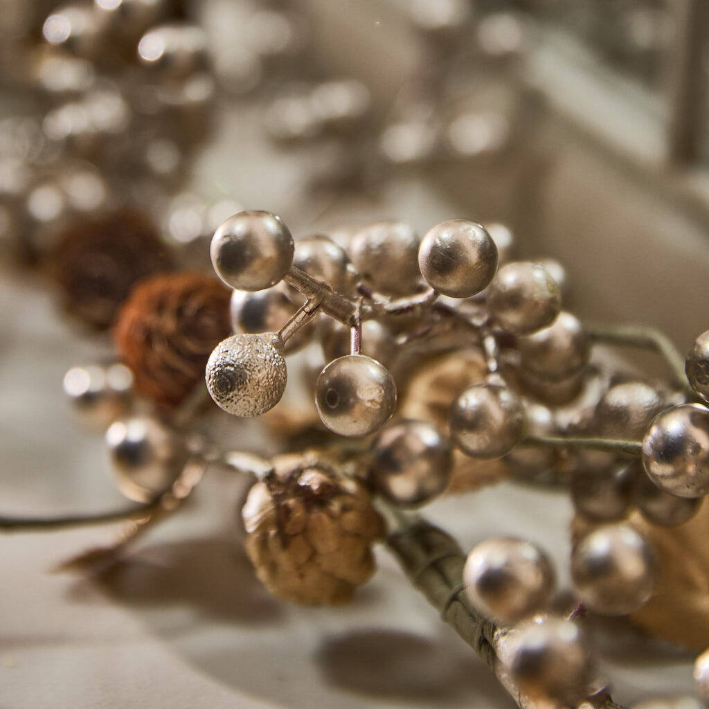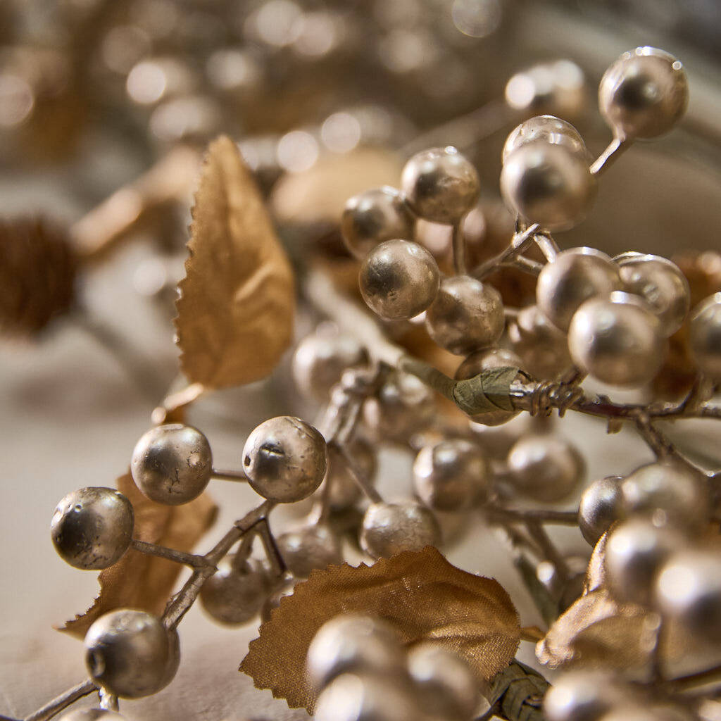 Each and every decoration is carefully attached to the robust wire frame, wrapped in a complementing coloured material for seamless blending. A daring move away from classic greens and reds but still brimming with character, the luxurious palette of shimmering gold tones are sure to wow your guests.
