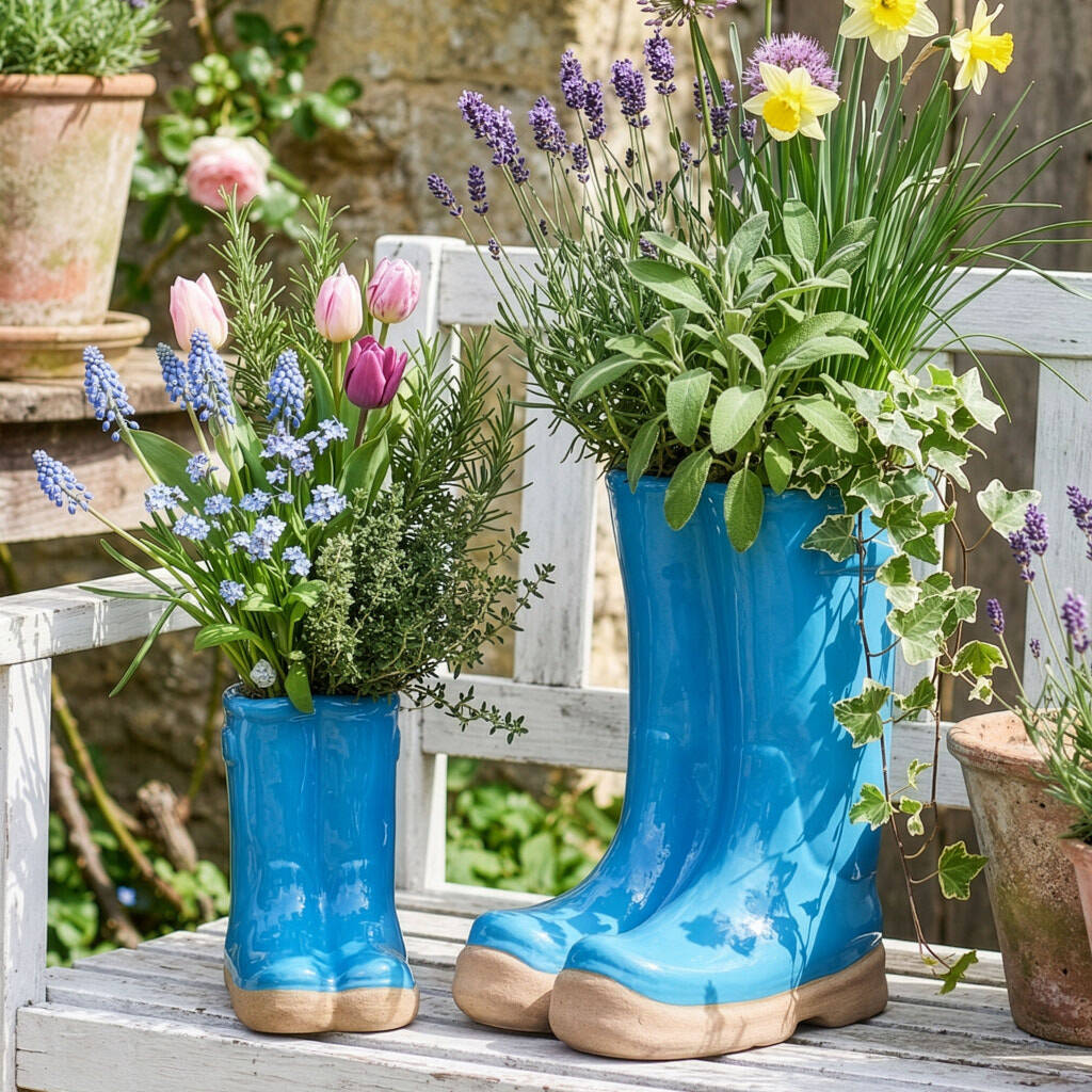 Made from durable stoneware with a high gloss treacle glaze finish in a sky blue colour, each plant pot is complete with relief "buckle" detailing. Featuring a natural chunky sole with a rough grain finish for a contrasting texture, the grip underneath will keep the boots firmly in place wherever displayed.