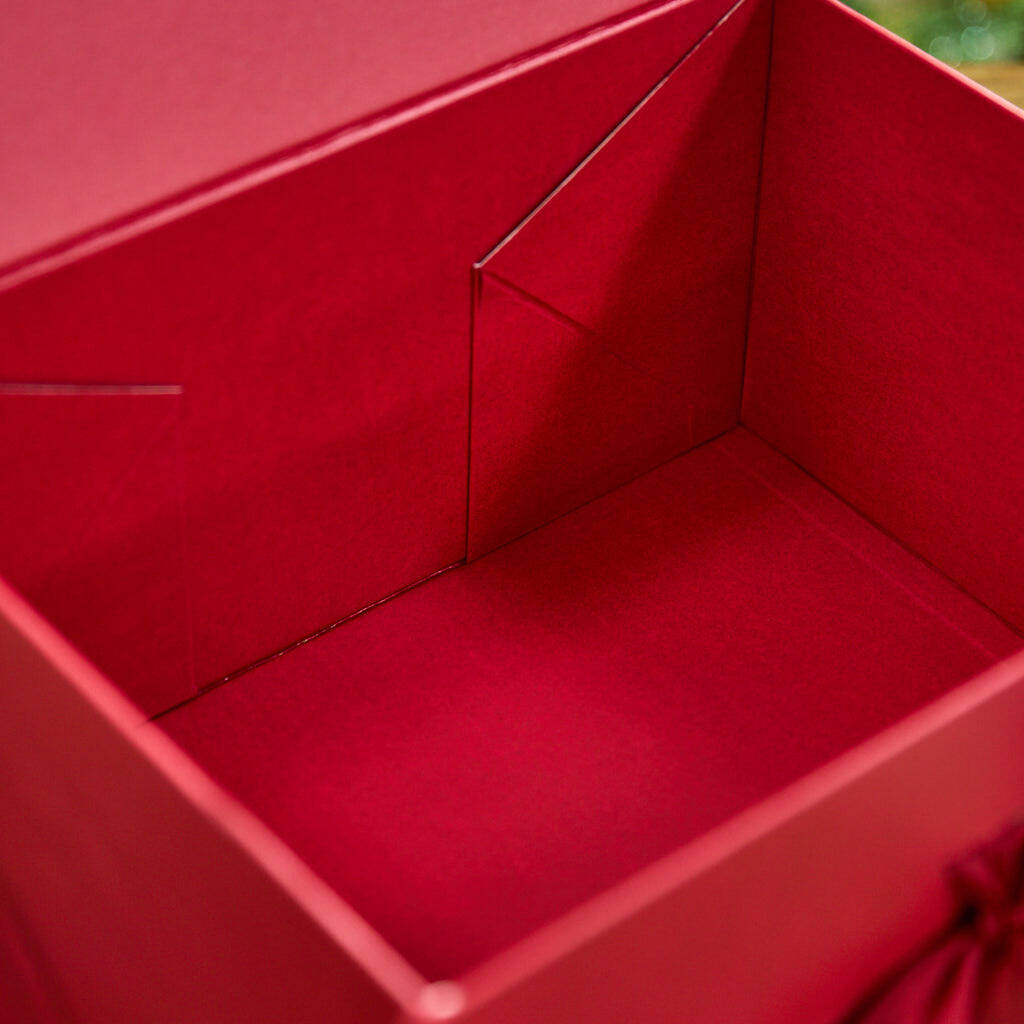 The A4 sized box is finished with a silky grosgrain ribbon fastener, and opens to reveal a spacious and deep inner with a magnetic lid that can fold all the way back. Boasting a rich red colour with a matte finish to perfectly suit presents for all occasions and people.