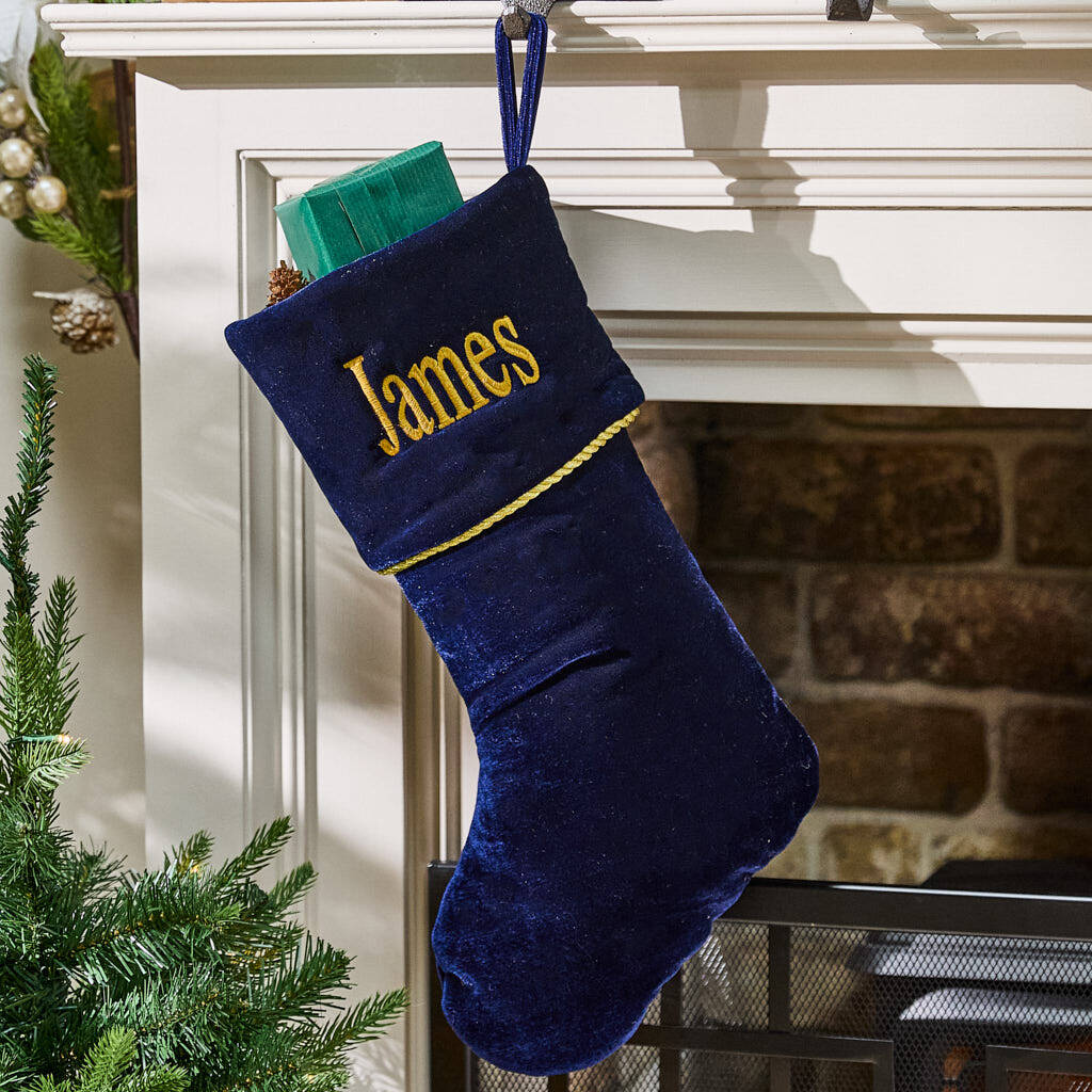 Perfect to hang in pride of place above the fire this Christmas, our opulent personalised festive stocking boasts a luxe deep blue colour.