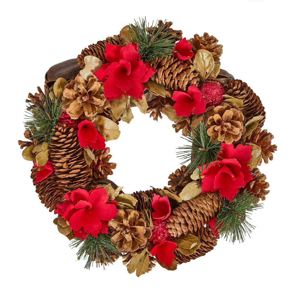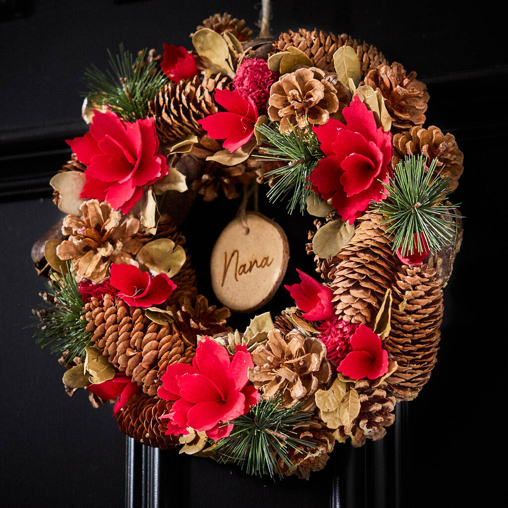 Our traditional wreath showcases an abundance of seasonal treasures. For an everlasting affair which can be brought out year upon year, the dried leaf sprigs and seed pods perfectly complement the large red poinsettia flowers and forest-foraged pinecones.