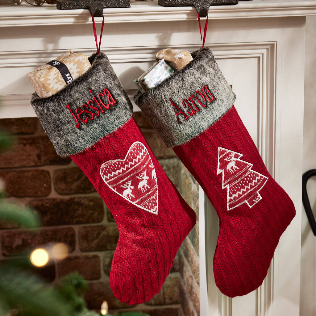 Fully lined and boasting a cable knitted front that's finished in bright berry red, these Scandi style knitted stockings are complete with a wonderfully soft faux fur cuff in rich grey.