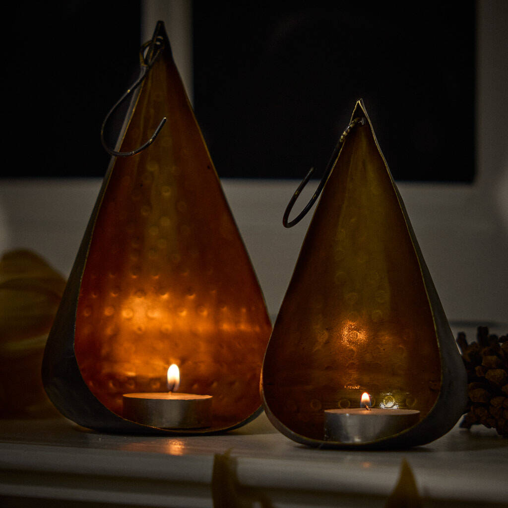 A pair of contemporary hanging metal candle holders with vibrant metallic brass detail that will make the perfect autumn home decoration or gift perhaps.