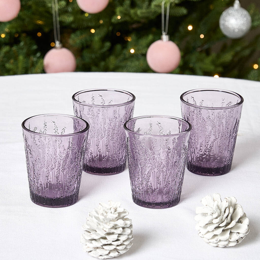Completely dishwasher safe, these luxury tumbler glasses boast a hand-pressed embossed floral design and a lavender purple colour.