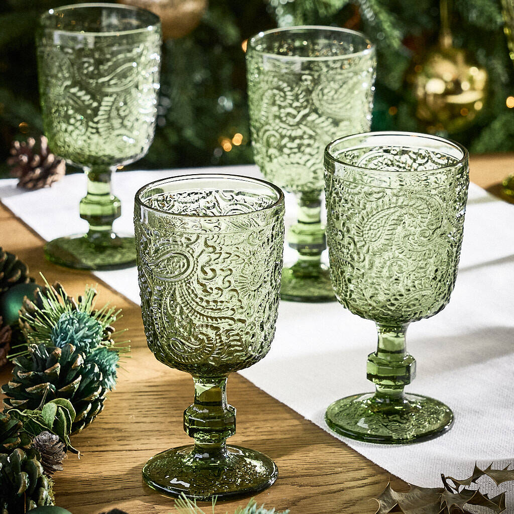 Completely dishwasher safe, these footed glass goblets boast a hand-pressed embossed paisley design and a beautiful emerald green colour that's perfectly suited to any occasion.