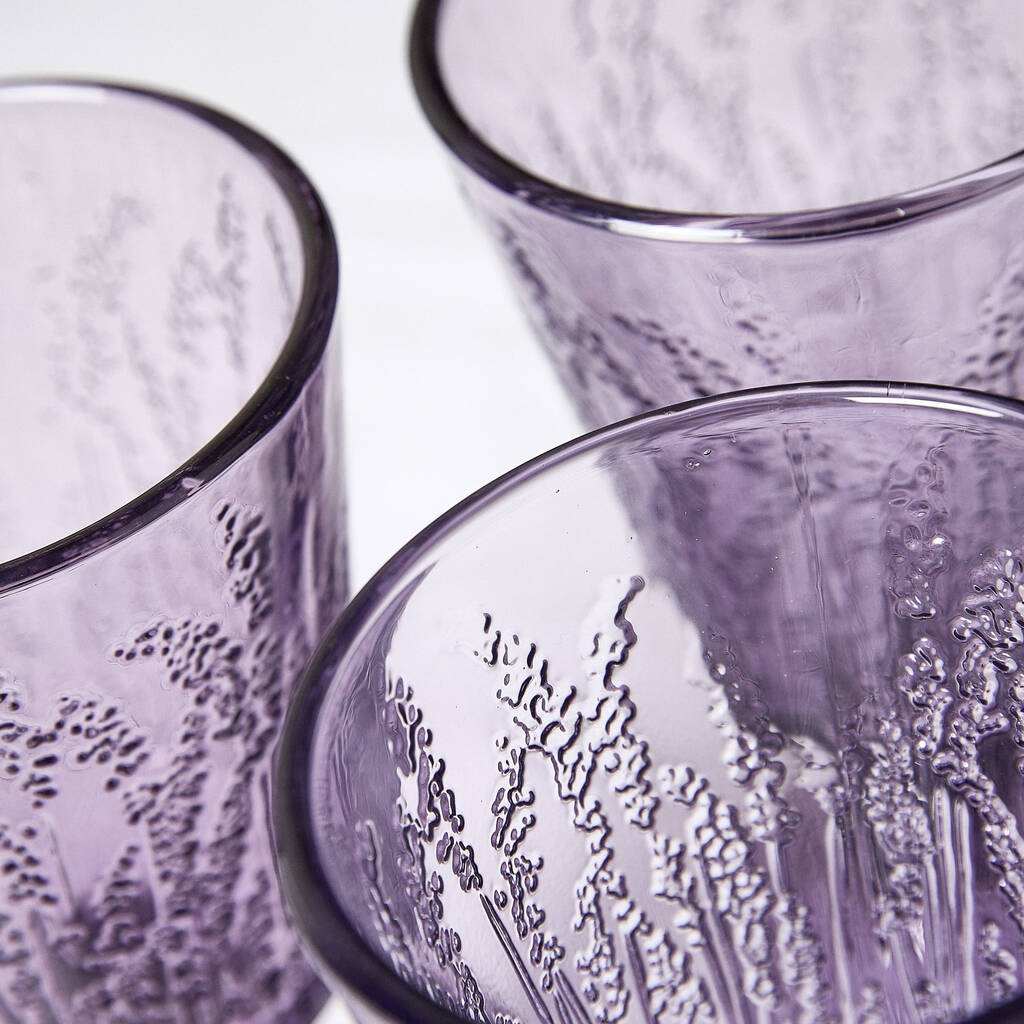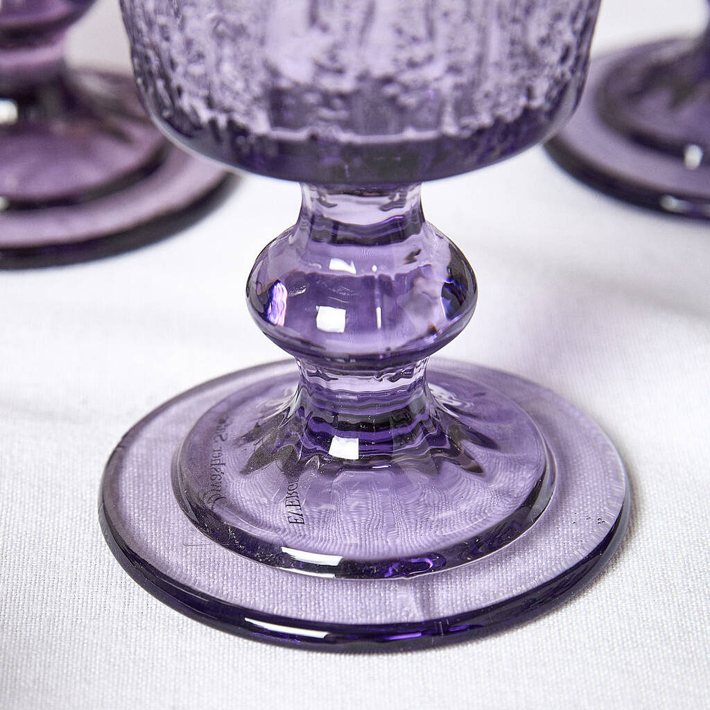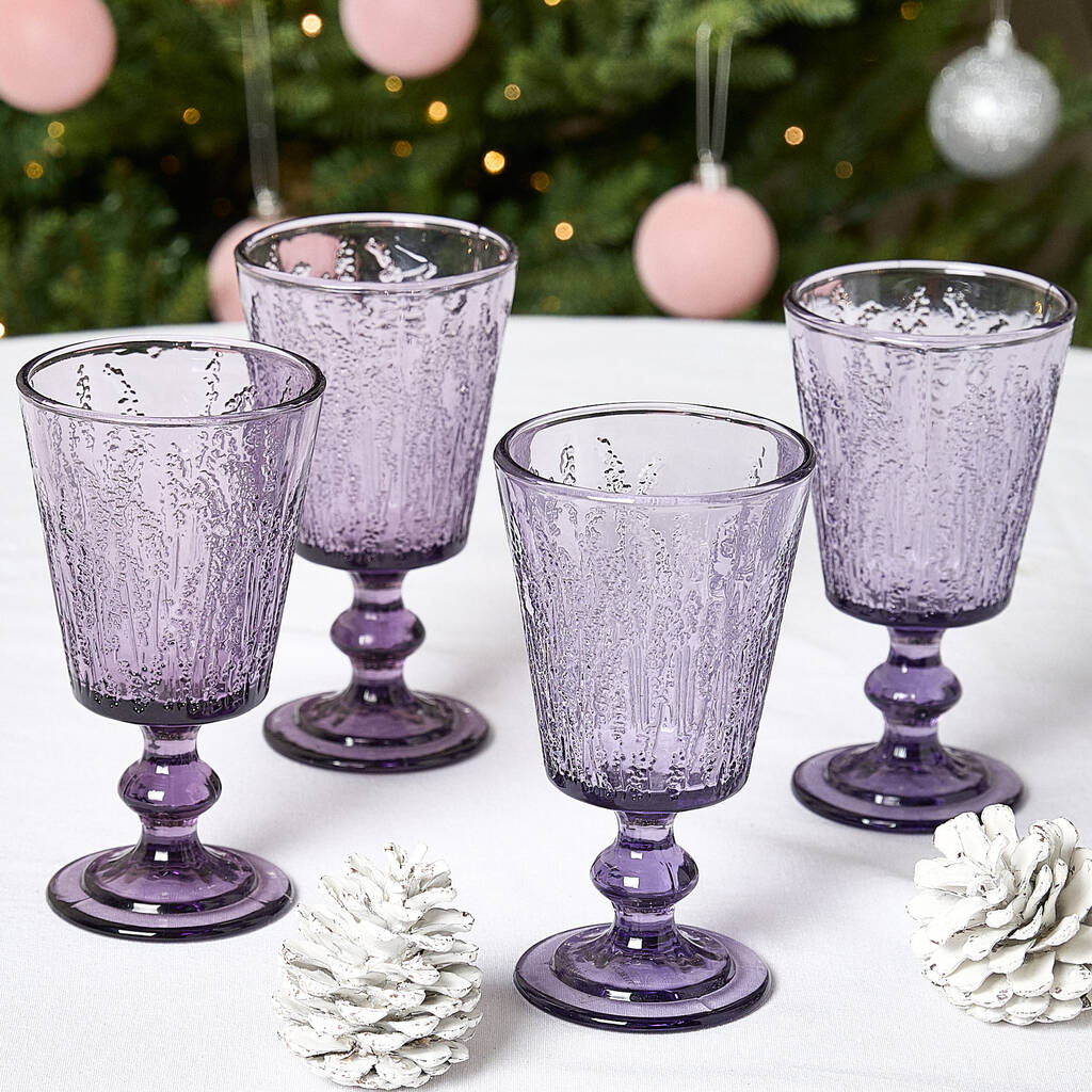 Completely dishwasher safe, these footed glass goblets boast a hand-pressed embossed floral design and a lavender purple colour.