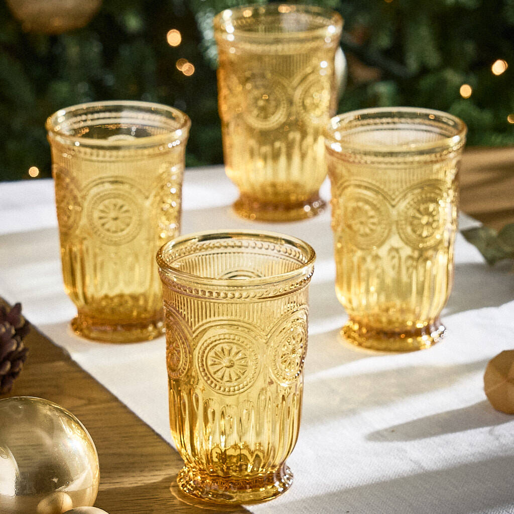 Completely dishwasher safe, these glass hiball tumblers boast a hand-pressed embossed intricate floral design and a golden yellow colour that's perfectly suited to any occasion.