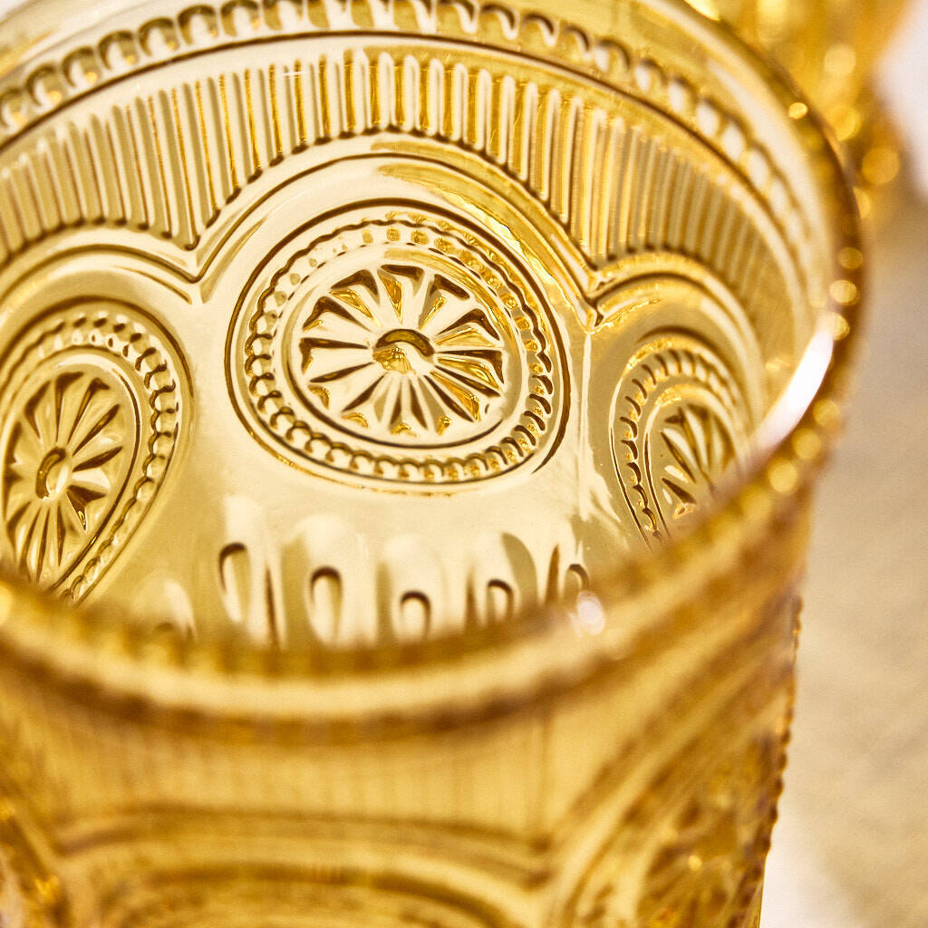 Each tall glass features a raised pattern with delicate beaded detail, and the jewel-bright amber colour will catch the light and sparkle beautifully.