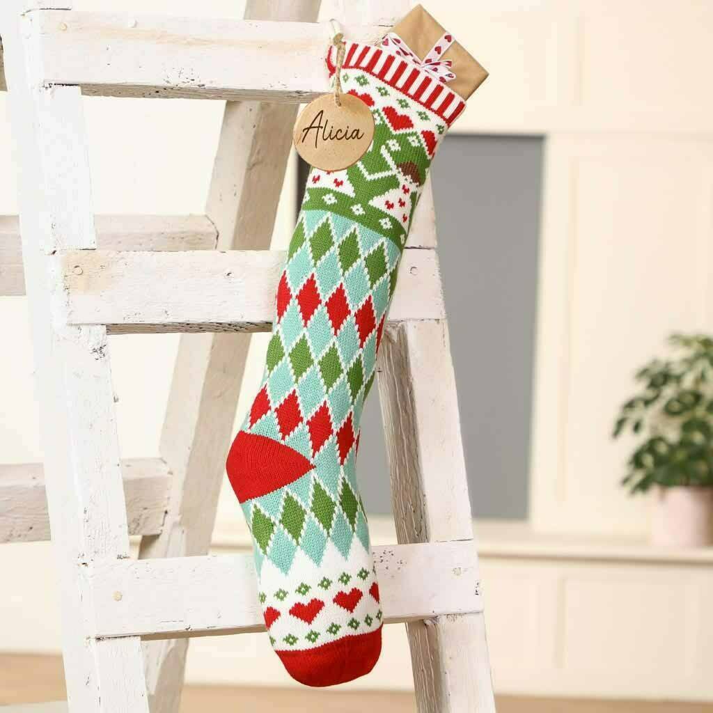 Traditional berry red and snow white meets unconventional canal blue, with accents of pine needle green to create an eye-catching, festive stocking that's full of fun and character.