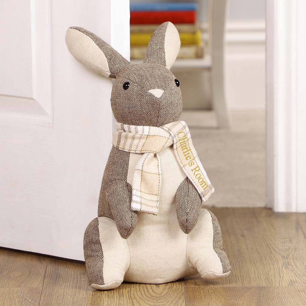 This beautiful country door stop features a simple design perfect for adding a touch of style to your home. This novelty rabbit fabric door stop has a hand stitched plaid scarf and is finished in a muted brown herringbone.