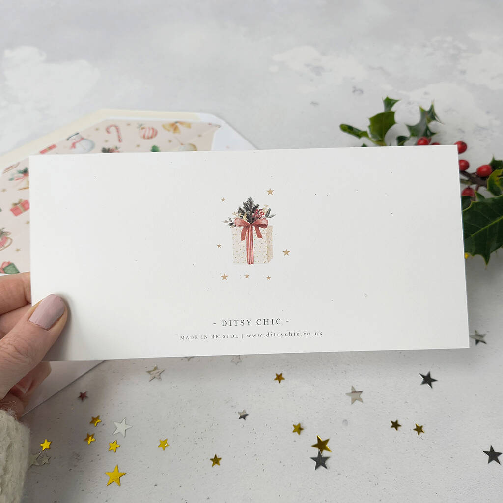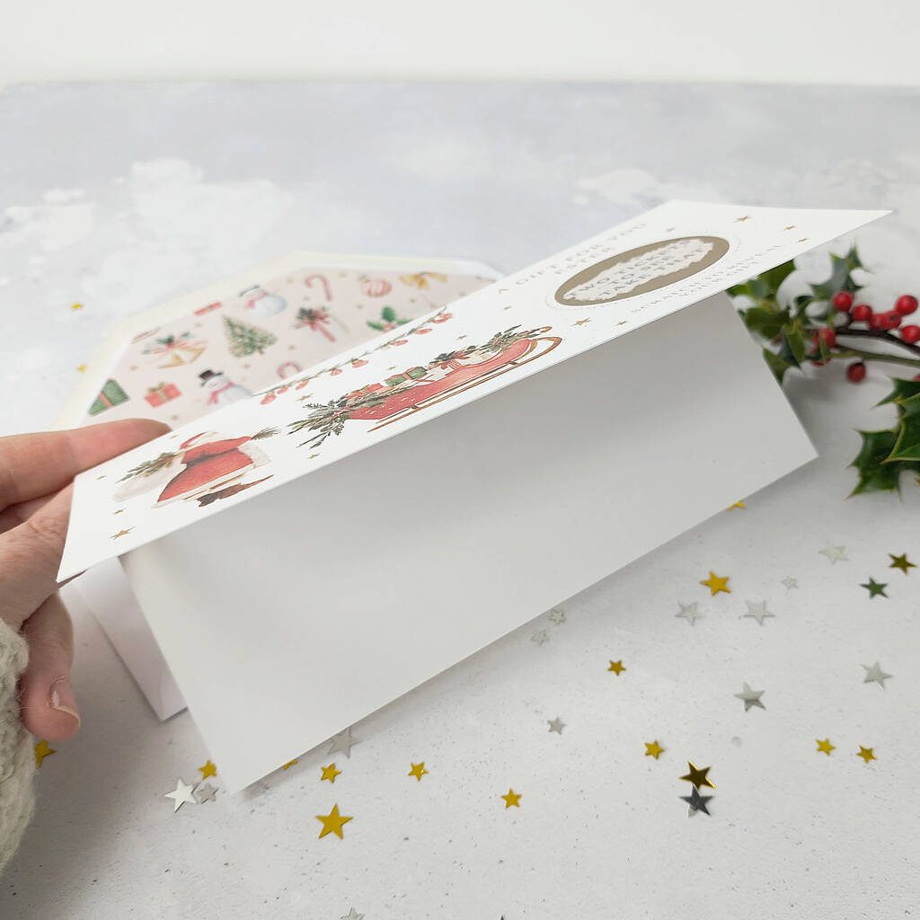 The whimsical, traditional Santa and sleigh illustration adds a touch of nostalgia to your gift reveal, making it ideal for both adults and children. This elegant card is the perfect way to present a festive experience, show tickets, or a weekend break. It makes a beautiful stocking filler and a gorgeous keepsake that captures the excitement of the season.