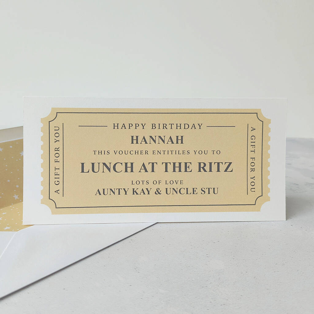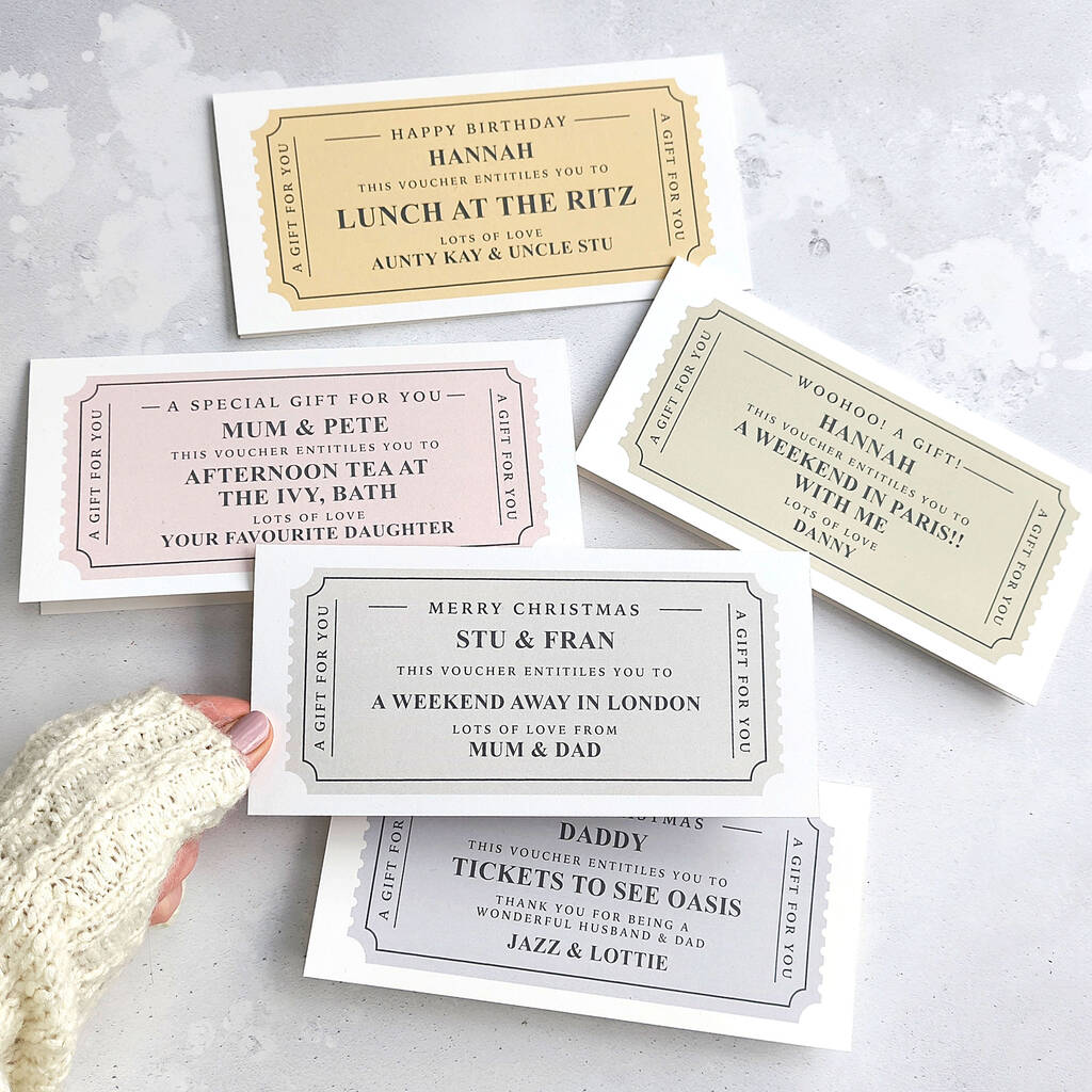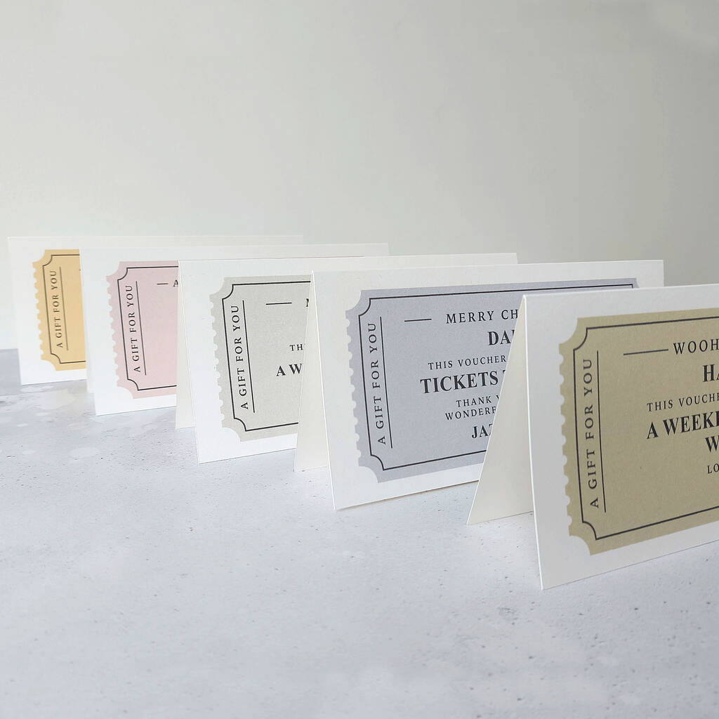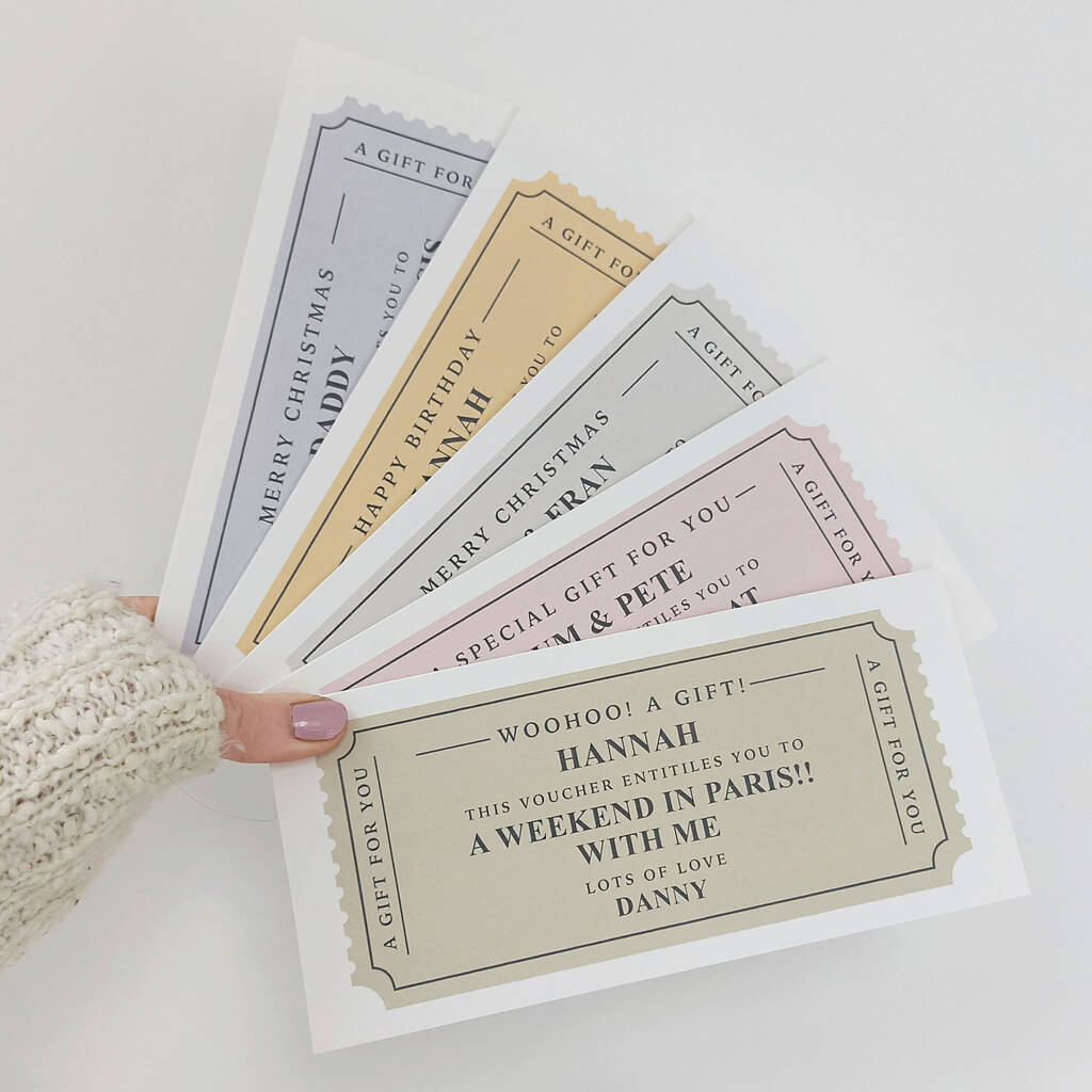 A luxurious personalised ticket-style gift voucher, perfect for revealing any special experience, trip, or thoughtful present.