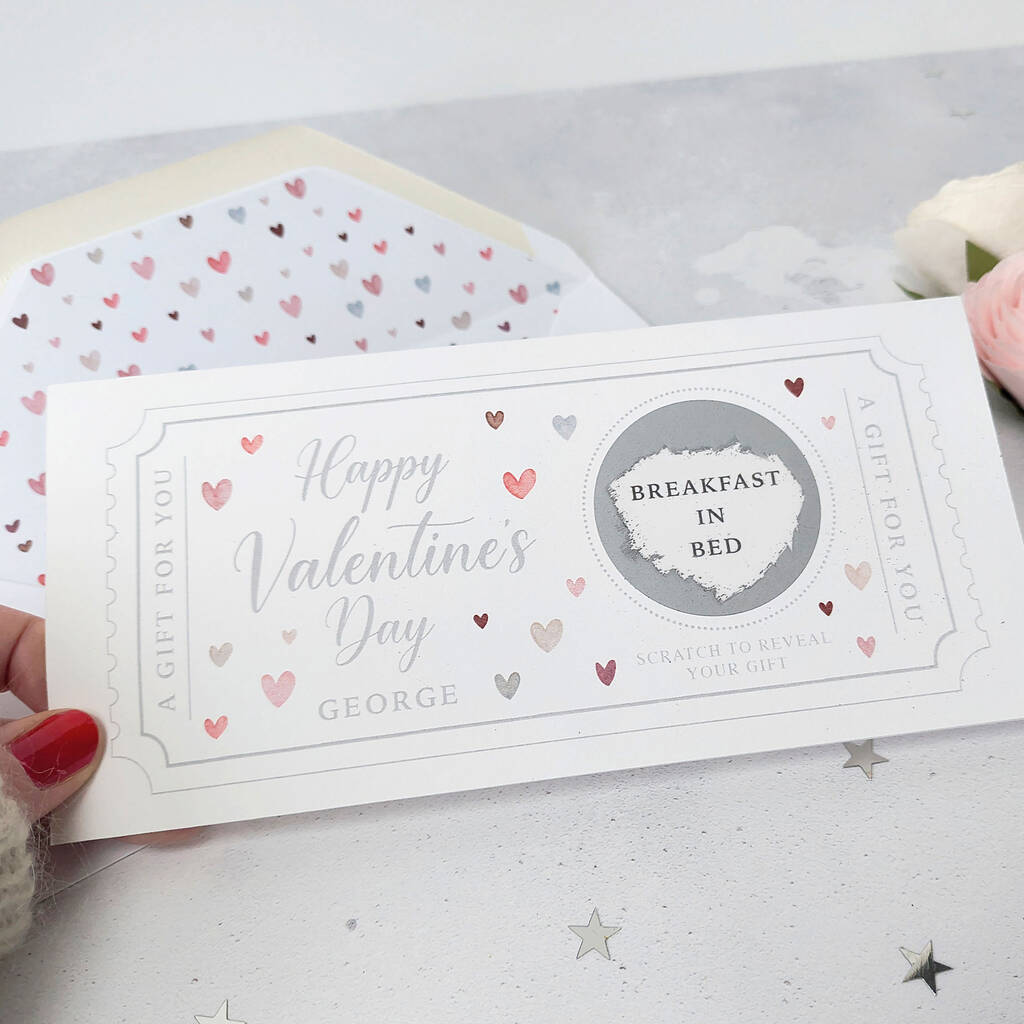 Personalised Valentine’s Day scratch to reveal ticket-style card with “Happy Valentine’s Day” text, your loved one's name and surprise gift message.