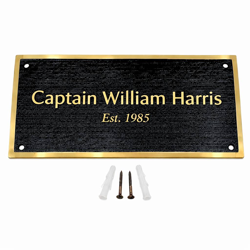 Elegant customisable black brass plaque designed for homes, offices, and memorials, featuring timeless engraved lettering and a refined classic heritage look.This customisable black brass plaque combines classic craftsmanship with timeless design. Featuring a textured black background with elegant brass lettering and frame, it offers a refined and highly visible display for names, businesses, memorials, or special messages. The plaque includes mounting holes and fixings, making installation on walls, doors, or entrances simple and secure.