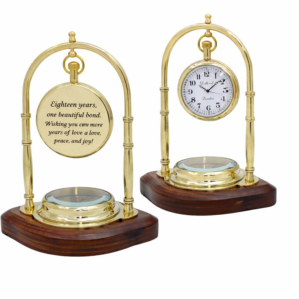 Personalised Brass 18th Anniversary Desk Clock With Compass