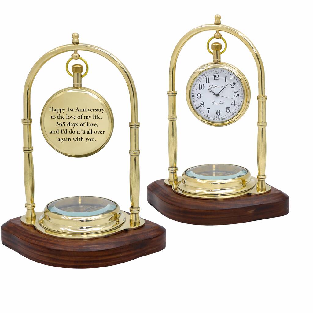 Personalised Brass 1st Anniversary Desk Clock With Compass