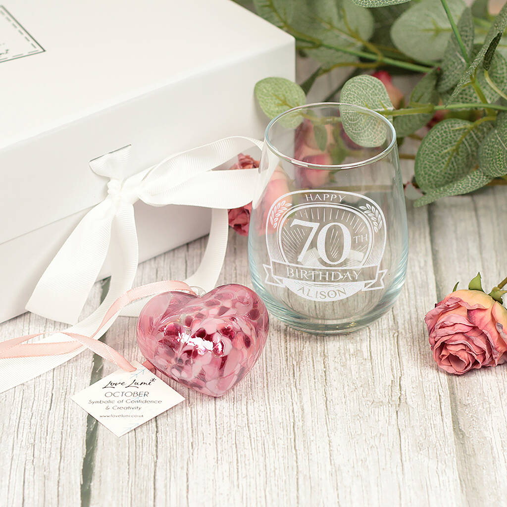 70th Birthday Stemless Glass And Birthstone Heart Gift Set