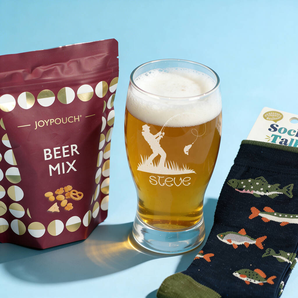 Fishing Pint Glass, Socks And Snacks Gift Set