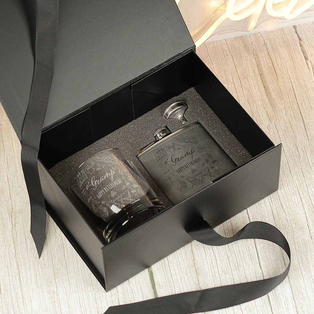 ~ Option 2: a luxury foam lined gift box with a matching engraved whiskey tumbler glass displayed alongside the hip flask and funnel
