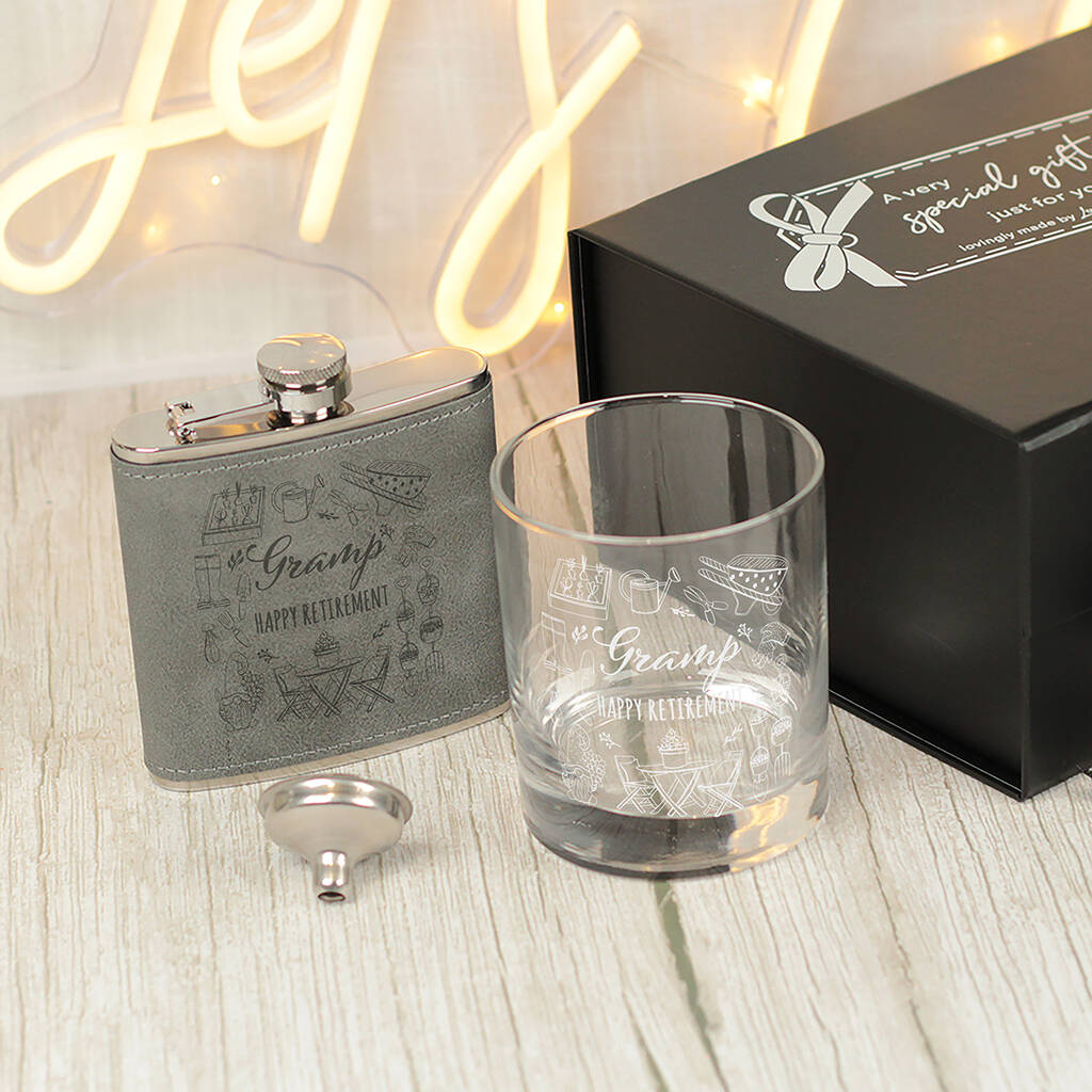 This stunning stainless steel Hip Flask and matching glass gift set is a stylish gift to celebrate a retirement.
