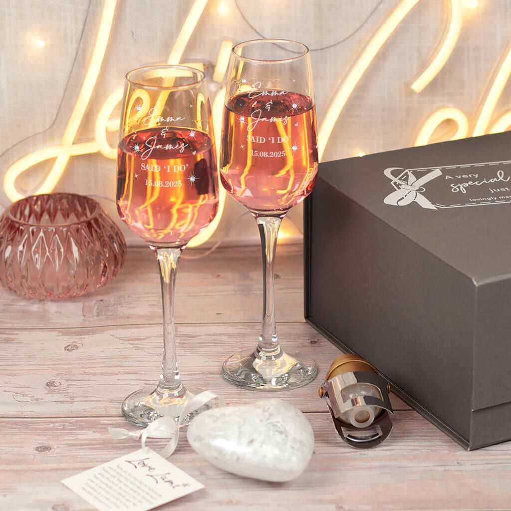Pair Of Wedding Diamante Glass Flutes With Glass Heart