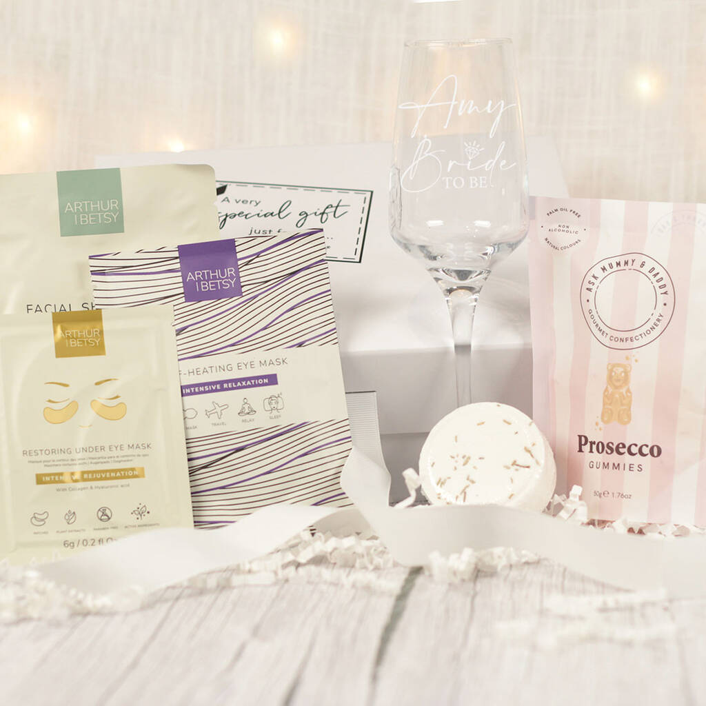 • An engraved champagne flute for them to enjoy a glass of their favourite bubbly. The glass is engraved with their name and the message 'Bride to Be' for them to use during the wedding planning.