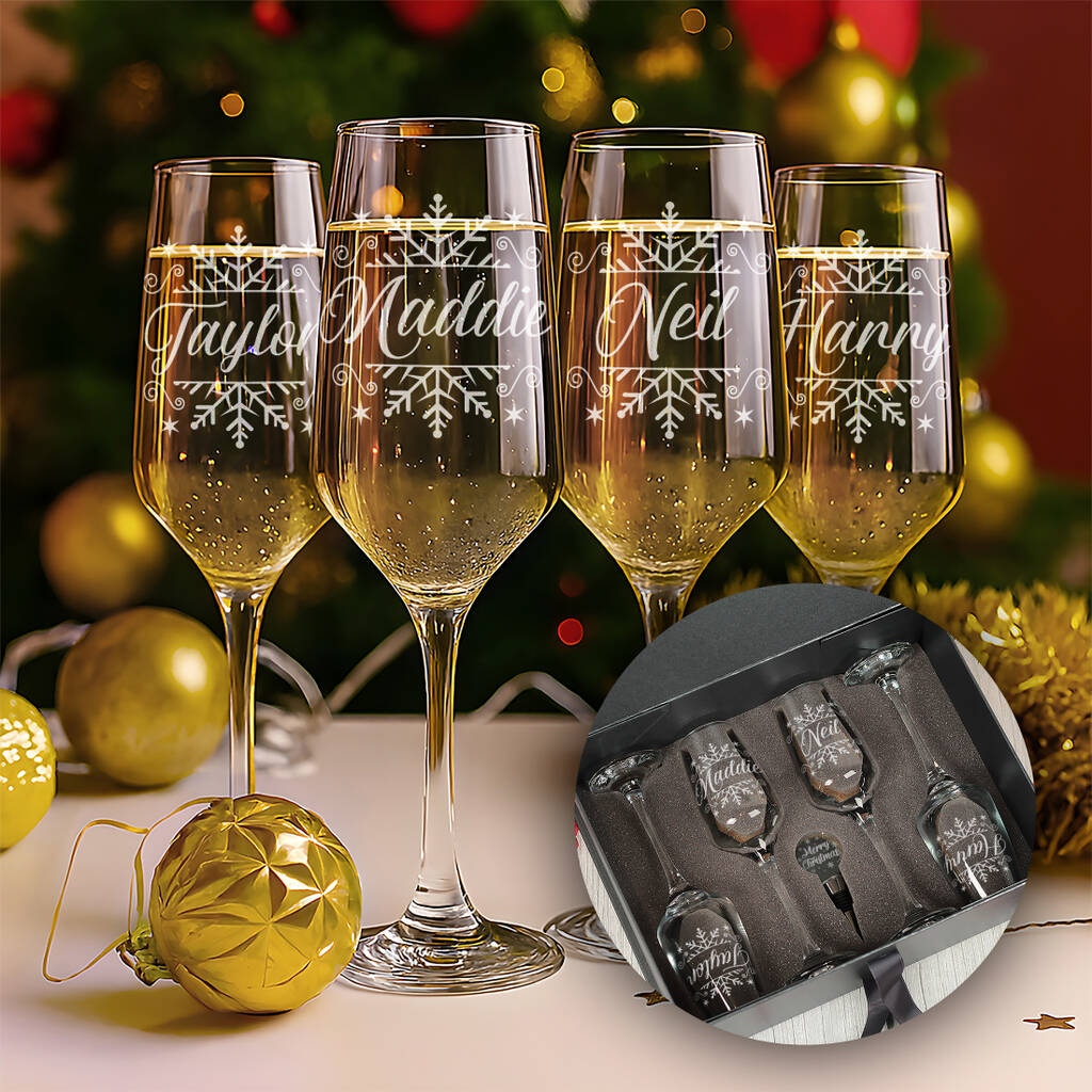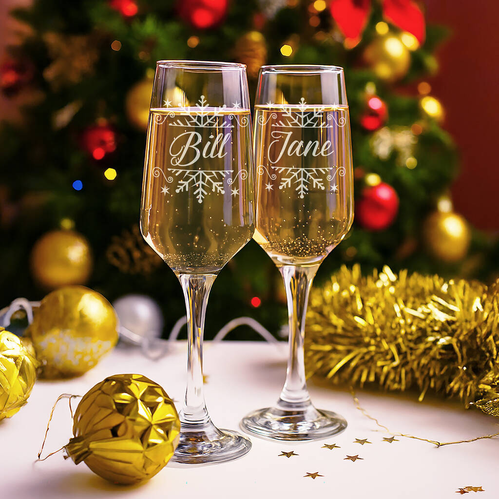 Personalised Christmas Snowflake Champagne Flutes And Gift Boxed Sets