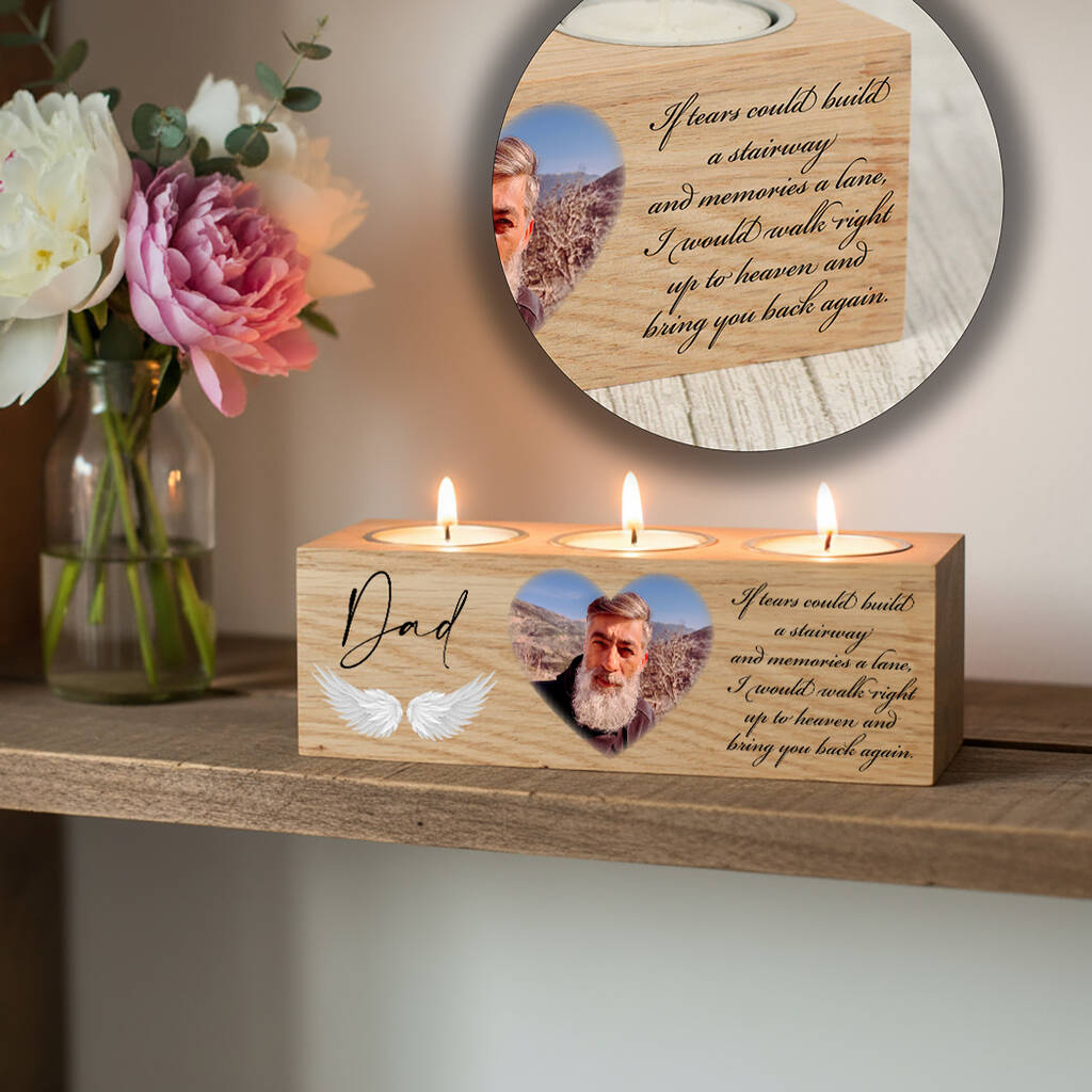Whether displayed on your mantel, side table, or anywhere in your home, this personalised tealight holder is the perfect way to honor someone who is sadly no longer with you. Simply send us your chosen photo after placing your order via a NOTHS message, and we'll take care of the rest. Give yourself or a grieving loved one the gift of comfort and remembrance with this one-of-a-kind memorial.