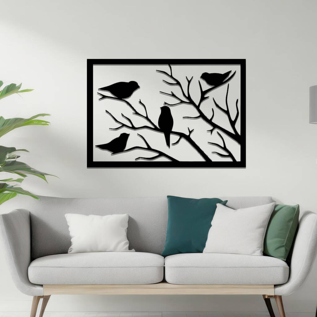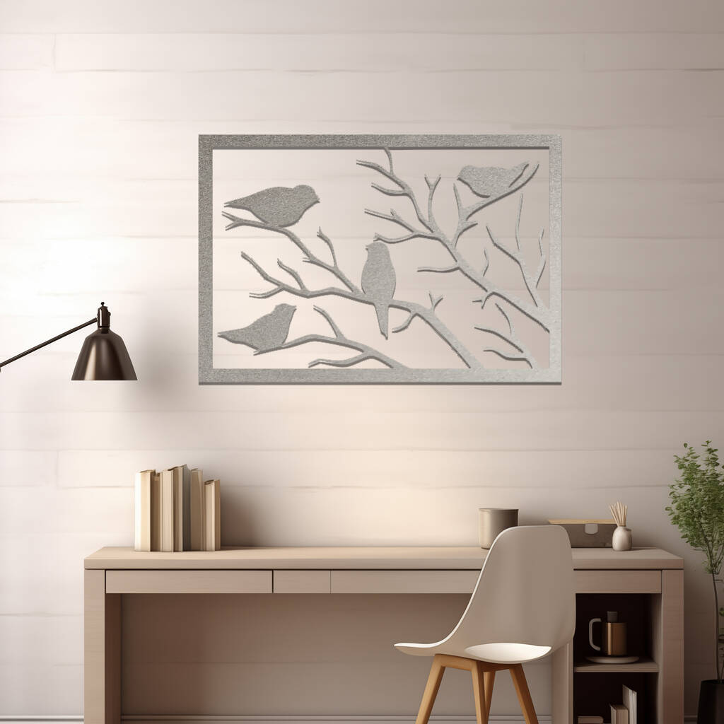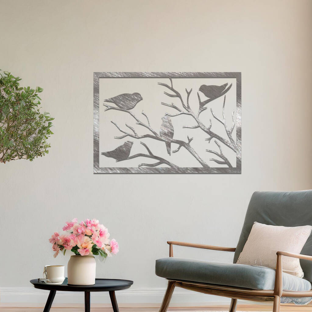 This striking handmade metal wall artwork captures the calm beauty of birds resting among tree branches, framed within a clean rectangular border. Its balanced composition and bold silhouette create a serene focal point for living rooms, hallways, bedrooms, or garden walls. Designed to suit modern, rustic, or industrial interiors, this piece conveys harmony and connection with nature. A thoughtful choice for birthdays, new homes, or anniversaries, it enhances any space with effortless sophistication.