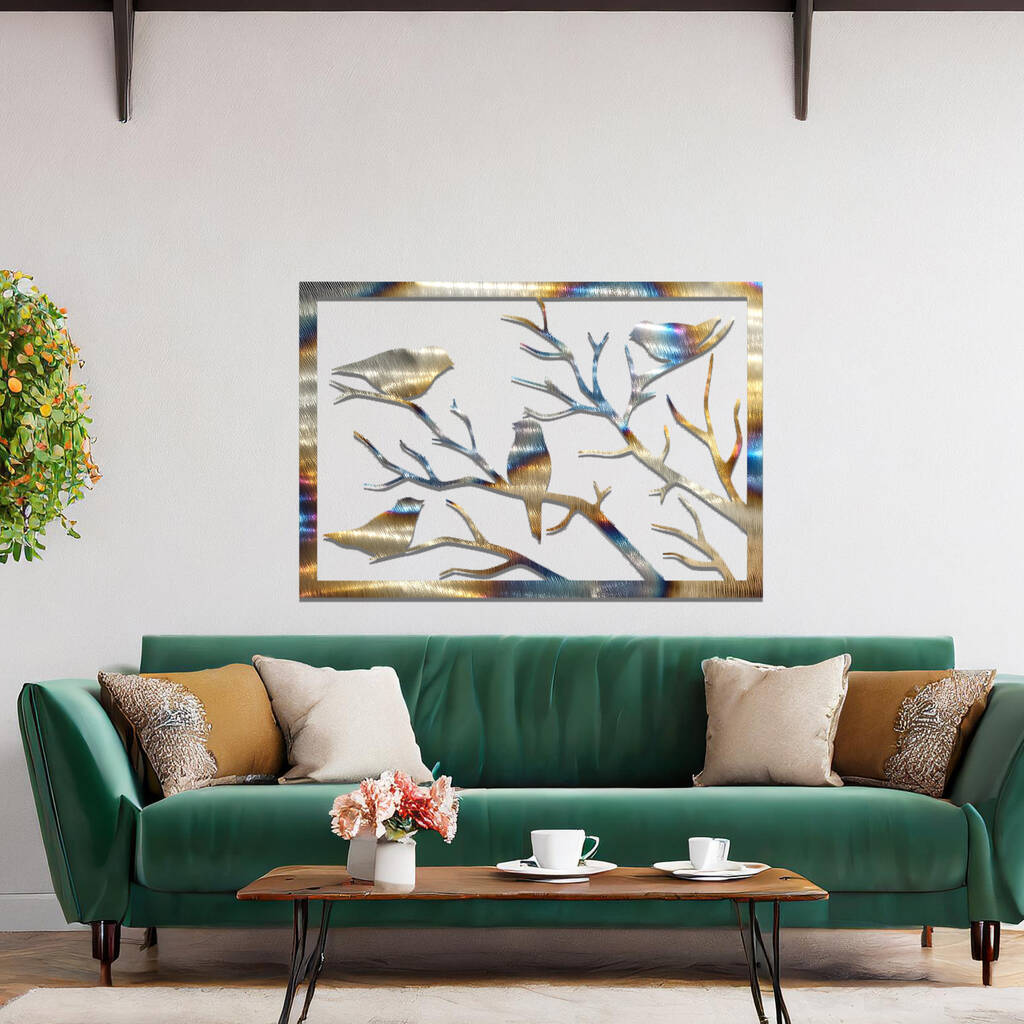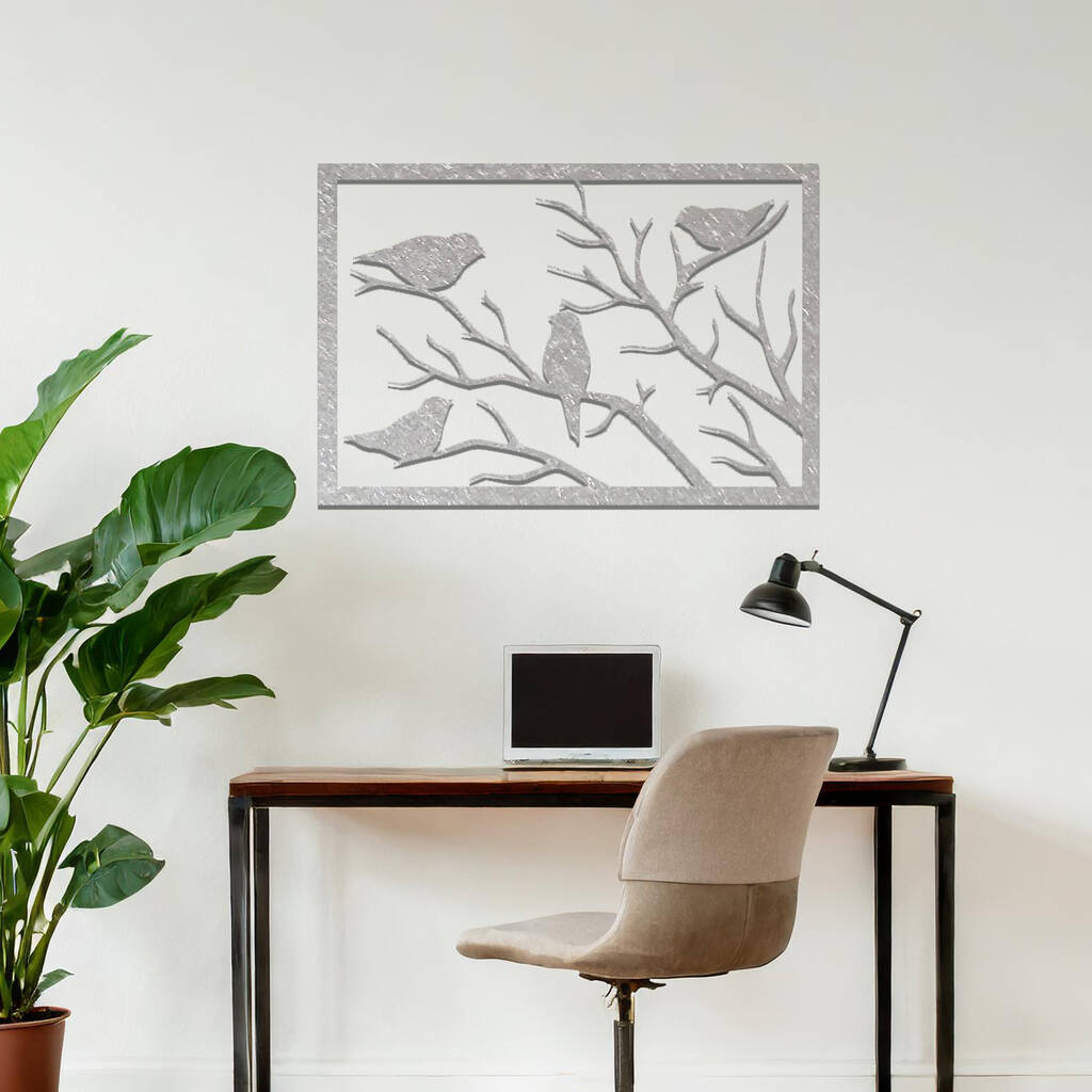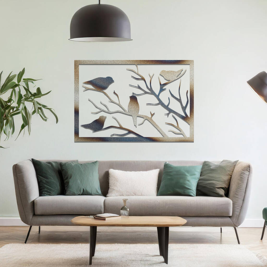 This striking handmade metal wall artwork captures the calm beauty of birds resting among tree branches, framed within a clean rectangular border. Its balanced composition and bold silhouette create a serene focal point for living rooms, hallways, bedrooms, or garden walls. Designed to suit modern, rustic, or industrial interiors, this piece conveys harmony and connection with nature. A thoughtful choice for birthdays, new homes, or anniversaries, it enhances any space with effortless sophistication.
